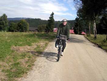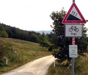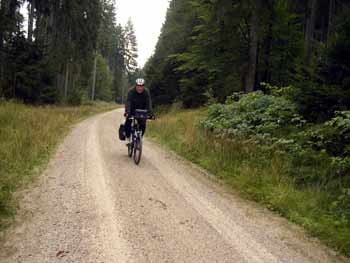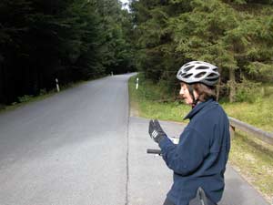In der Früh lesen wir 7°C auf dem Thermometer, aber die gefühlte Temperatur mit dem sog. "Chillfaktor" vom Gegenwind ist wesentlich niedriger. Trotzdem genießen wir die zügige Abfahrt nach Ludwigsthal, wo wir den Grünes-Dach-Radweg Richtung Bayerisch Eisenstein aufnehmen. Allmählich fängt der unbefestigte Waldweg an zu steigen und wir kommen ins Schwitzen, obwohl die Luft kaum wärmer wird. Hier ist es steil. Auch das Schieben ist mühsam. |