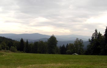 | Um etwa elf Uhr sind wir oben am Brennes und genießen einen wunderbaren Weitblick über die bewaldeten Berge des Bayerischen Waldes. Bevor wir weiter fahren, kehren wir für einen heißen Tee und Kaiserschmarrn ein. Das tut gut, denn wir sind verschwitzt und frösteln in der kühlen Bergluft. |