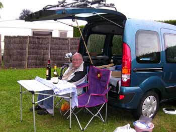 Und weil es kurz aufhört zu regnen, fange ich leichtsinnigerweise an zu kochen. Kochen im Freien, versteht sich. Wo sonst. Wir genießen dabei ein Campari Soda und fühlen uns pudelwohl - bis es wieder anfängt zu regnen. So mit Regenjacke und halb unter dem aufgeklappten Heck vom Auto wird weiter gekocht. Dann sitzen wir zusammengekauert unter der Heckklappe wie zwei begossene Pudel und essen Spaghetti mit Thunfischsauce. Es schmeckt trotz allem, oder vielleicht erst recht. |