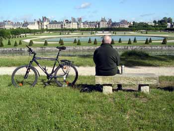 Montag, den 23. Mai Wir radeln durch die weitläufige Parkanlage von Fontainebleau, das Schloss lässt sich noch nicht erblicken. Ich bin begeistert - wir sind hier in Fontainebleau mit den Rädern, so wie ich es in München an meinem Schreibtisch geplant habe. Die Lage und Gärten haben sehr viel Charme, das asymetrische Schloss, riesig groß und unüberschaubar, liegt wunderschön in dem Park eingebettet. |