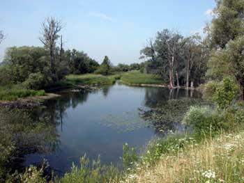 | Mittwoch, 22.06.05 Wörth - Deggendorf, 60 km Um acht Uhr unterwegs: Es ist herrlich friedlich in der frischen Morgenluft, kein Mensch weit und breit. Wir bleiben auf dem Dammweg und fahren den ganzen Bogen der Donau aus, der eigentlich nicht als Radweg vorgesehen ist. Um uns herum unberührte, stille Donau-Auen. Wir sehen wie ein Reh graziös durch die Wiesen springt, sein Kitz langsamer hinterher, dann wartet das Muttertier auf das Kleine und gemeinsam laufen sie weiter. Und der Hase: lang merkt er uns nicht, wie wir heran fahren, dann schießt er weg und legt dabei ein derartiges Tempo zu, dass ich laut lachen muss. |