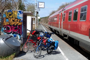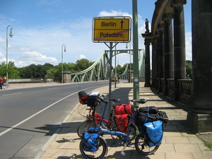 | June 2009: To France the Long Way The shortest way to France from Munich would be about 300 kilometers. We reached the French border after pedaling 2,300 kilometers. On a round-about route we cycled north to Berlin, west to Hamburg and Groningen in the Netherlands and south as far as Rouen in France. By then we had enough headwinds and rain. Our Bike Fridays, folding bikes, made it possible to continue by train to southern France and finally back to Munich two months later. |