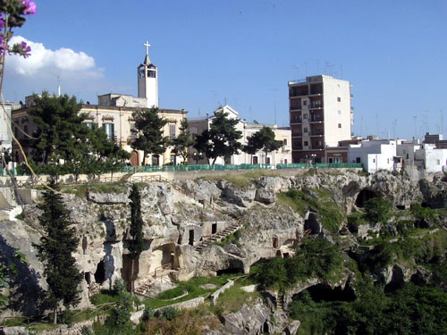 A long downhill ride into plains covered with vineyards, olive groves and orange orchards follows. As we approach Massafra the air in the afternoon heat is heavy with the perfume of orange blossoms. Massafra stands on either side of a deep ravine which separates the old and new city. As in Matera, the many caves have been used for dwellings and churches since earliest times. |