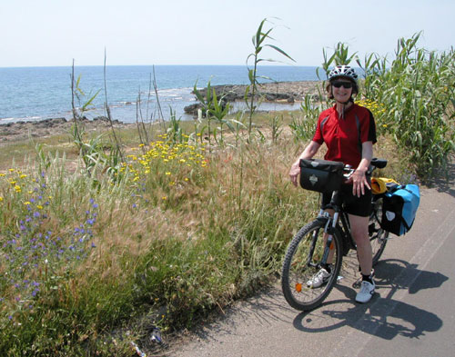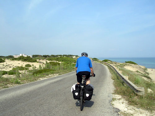 I think this must be lunch-rush-hour traffic we encounter on our way out of Taranto. For kilometers the traffic is at a standstill, to our advantage of course. We zip past them all. This isn't the first time we've seen the cities and towns in Apulia absolutely choked with cars. On the coastal road it's a different story. The road is quiet, the view fantastic and we even have friendly tailwinds to propell us along. |