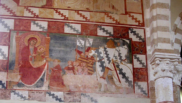...and very interesting Byzantine and 14th century frescoes. Here the painting of Maria with Christ Child includes Crusaders as they must have appeared in Brindisi in the 14th century on their way to the Orient. |