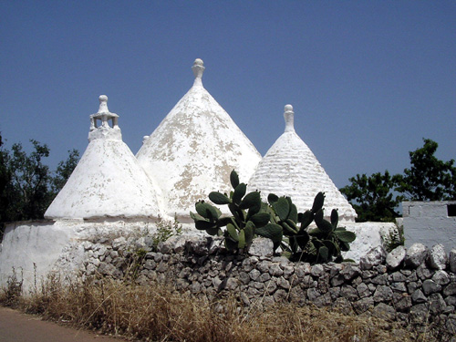 We see our first trulli. A trullo (plural: trulli) is a traditional Apulian stone dwelling with a conical roof, in the past built without any cement or mortar. |