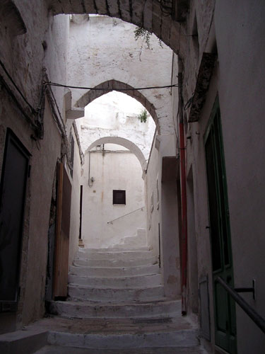 From the distance Ostuni looks like a stack of white building blocks. It is a medium sized town with many small back streets, archways and stairs, parts of town that for obvious reasons have never seen motorized vehicles, or non-motorized ones for that matter. |
