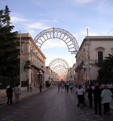The corso is just beginning The celebration of the patron saint of a town is a major festivity. For this event, huge scaffoldings in the form of archways and towers with innumerable light bulbs line the squares and avenues. We also witness brass bands, fireworks and a Catholic mass held on an open-air stage. |