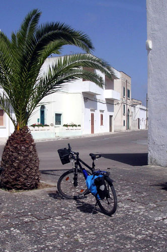 The German winter is long. And we are impatient to get started with the cycling season. Once again we review the map of southern Europe, looking for a land of early spring sunshine and mild temperatures, not too hilly and not too flat, good food.... We decide on Apulia, southern Italy, the heel of the boot (see map below). I'm not terribly keen on long car trips but in this case taking the car with the bicycle rack seems to be the best solution. By train from Munich it would be a long ride with many changes. We decide to make it a liesurely trip with a couple of stops in between, visiting a friend in South Tyrol and stopping off in Florence and Assisi on the way. Once in Apulia, we expect it shouldn't be too difficult to find a Bed & Breakfast where we can safely leave our car for a few weeks while we cycle. And that is exactly what we did. |