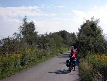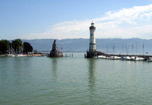 Ein sonniger Tag nach vielen Regentagen - ein guter Anfang. Um 13.15 in Lindau ist der erste Eindruck am Bodensee südländisch. Der See schimmert blau mit weißen Segelbooten darauf gesprenkelt, viele Menschen drängen auf der Uferpromenade, Seemöven kreisen über uns. Wir machen uns auf den Weg nach Bregenz. Es sind viele Radler unterwegs, aber wenige mit Gepäck, also Tagesausflügler. Umso weiter wir fahren, desto ruhiger wird es. |