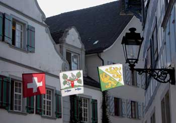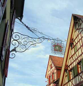 Am Nachmittag sind wir in Laufenburg, einer Stadt, die zur Hälfte in der Schweiz und zur Hälfte in Deutschland liegt, getrennt durch den Rhein. Die vielen Brunnen, schönen Bürgerhäuser und prächtigen Aushängeschilder begeistern uns. Wir schlafen im Hotel zum Rebstock, einem der ältesten Häuser in Laufenburg, hoch über dem Rhein. Es ist sehr bequem, das Frühstück fantastisch, die Übernachtung kostet 82€. Die schweizerischen Aushängeschilder sind eine wahre Freude und zudem ein lohnendes Fotomotiv. "Da früher nur ein kleiner Teil der Bevölkerung lesen konnte, war es üblich, Gebäude mit Schildern zu versehen, um den Hausnamen und/oder den Zweck des Gebäudes kenntlich zu machen. Schuster brachten an ihren Häusern z. B. ein Aushängeschild in Form eines Stiefels an usw. Die Schilder sind meist silhouettiert aus Blech hergestellt. Aus Prestigegründen und um die Aufmerksamkeit der Passanten zu erregen, wurden die Umrandungen der Aushängeschilder und die Ausleger oft besonders kunstvoll geschmiedet." |