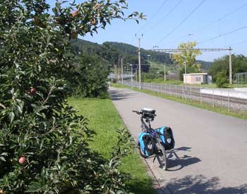 | Heute sehen wir viel und fahren wenig. Berlingen ist ein hübscher Ort, auch die Nachbargemeinde Steckborn. Schöne Fachwerkhäuser sind an der Hauptstraße aufgereiht, alles schmucke und gepflegt. Der heutige Radweg verläuft häufig neben Eisenbahngleisen und an Obstplantagen - Apfel und Birne - vorbei. Bei Stein am Rhein ist der Untersee zu Ende und der Rhein setzt seinen Kurs fort. |