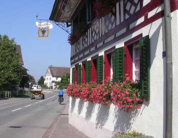 | Das Wetter ist mittelmäßig, eher wolkig als sonnig. Schon ab Jestetten fahren wir durch eine schöne Landschaft, Dörfer mit prächtigen Fachwerkhäusern und bunten Gärten. Zuerst geht es nach Lottstetten (wo unser sehr guter Weißwein von gestern abend herstammte), dann Rafz, über die schweizerische Grenze nach Hohentengen, dann eine lange nervende Steigung, optisch kaum wahrnehmbar - die schlimmste Sorte - nach Lienheim, Kadelburg und wieder über die Grenze nach Deutschland vor Waldshut. Der Gegenwind hört nicht auf. Zwischen Dogern und Altenbruck fahren wir ein Stück Dammweg, hübsch und ruhig aber doch ein bisschen langweilig, wie es Dammwege oft an sich haben. |