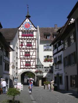 Von Altenrhein sind es noch vier Kilometer bis Rorschach. Von der Stadt bekommen wir wenig mit, weil der Radweg am Ufer bleibt und wir nicht gewillt sind, uns in den Straßenverkehr zu stürzen. Das Wetter ist herrlich, keine Wolke am Himmel. Erst am Nachmittag kommen Schleierwolken, hoffentlich kein Schlechtwetterzeichen. Wir schauen das Städtchen Arbon, vom Lateinischen Arbor Felix, an und entdecken eine herrliche Altstadt mit Fachwerkhäusern und kunstvollen Fassaden. |