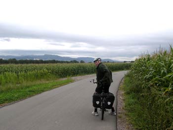 Bisher sind uns auffallend wenige Radfahrer auf dem Rhein-Radweg begegnet, bloß am Bodensee waren sie keine Mangelware. Seit dem wir den Bodensee-Radweg hinter uns gelassen haben, haben wir diesen sehr gut ausgeschilderten, verkehrsarmen bis -freien, meist asphaltierten Radweg für uns allein, und zwar im August, wo viele Länder noch Schulferien haben. Diese tollen Radwege, auf denen man vom Autoverkehr weitgehend unbehelligt tausende von Kilometern fahren kann, sind ein wahrer Luxus. Während wir diese Bequemlichkeit genießen und schätzen, ist es ein ziemlich gezähmtes Tourenfahren verglichen mit dem Reisen auf eigener Faust, wie zum Beispiel im Baltikum, wo wir uns voriges Jahr herumgetrieben haben. |