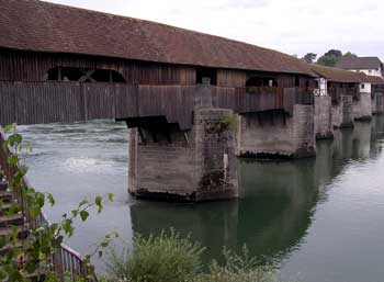 | Ein ereignisvoller Tag. Das schöne Wetter am Morgen hält leider nicht sehr lang. Wir werfen noch einen Blick auf die Stadt, machen ein paar Fotos, und es geht weiter über reizvolleWege auf der deutschen Seite des Rheins nach Bad Säckingen. Der schöne Turm, Marktplatz mit Fassadenmalereien und barocke Kirche lenken von einigen weniger schönen Neubauten dazwischen ab. Das Prachtstück der Stadt ist die historische Holzbrücke über den Rhein. |