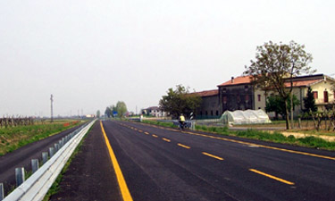 Wir begeben uns auf den Weg. Janos führt uns geschickt aus der Stadt heraus, wir kommen auf kleine Straßen voran. Irgendwann auf dem Land verfransen wir uns doch, machen einen großen Umweg durch ausgedehnte Apfelplantagen und müssen ein Stück Straße mit viel Verkehr fahren. Zum Ausgleich kommen wir dann auf einen Asphaltstreifen im Ausbau, noch nicht für den Verkehr freigegeben. Hier sind wir allein. Kurz vor Belfiori entdecken wir eine kleine schöne Kirche am Stadtrand. |