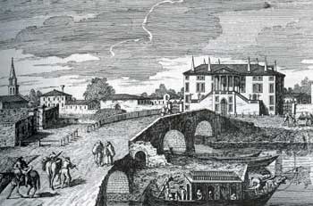 Ansicht der Villa Foscarini mit der alten Brücke von Strà, um 1750. Die heutige Straße entstand erst in der zweiten Hälfte des 19. Jahrhunderts. |