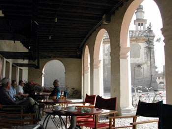 In Badoere ist der Marktplatz integriert in der riesengroßen Rotonda mit Arkaden und Säulen, die früher als Wirtschaftsgebäude der heute zerstörten Villa Badoer Marcello angeschlossen war. |